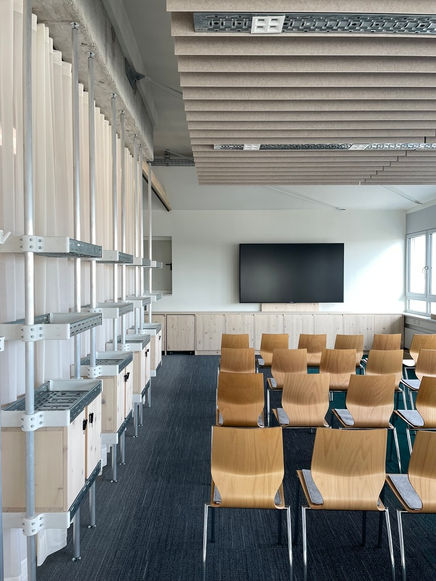 Most of the materials used - from the glass partitions to the wall cladding made from old theater and school chairs - already had a first life, as did the furniture. “Compared to conventional construction methods, we have saved 82% of CO2 emissions and 32% of water through reuse.“ says Sven Urselmann.