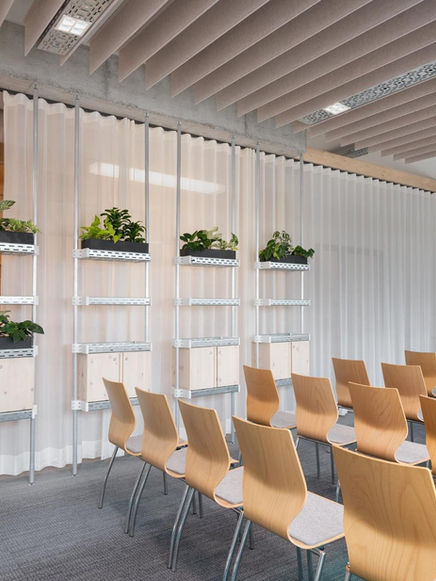 ReCycle – All carpets used in AWM are cradle-to-cradle certified, made from recycled materials and further recyclable. Kitchen counter and table tops are made of recycled plastic boards and ceiling acoustic baffles made by recycled PET bottles, old tables from AWM got new tabletops made of recycled textile boards.